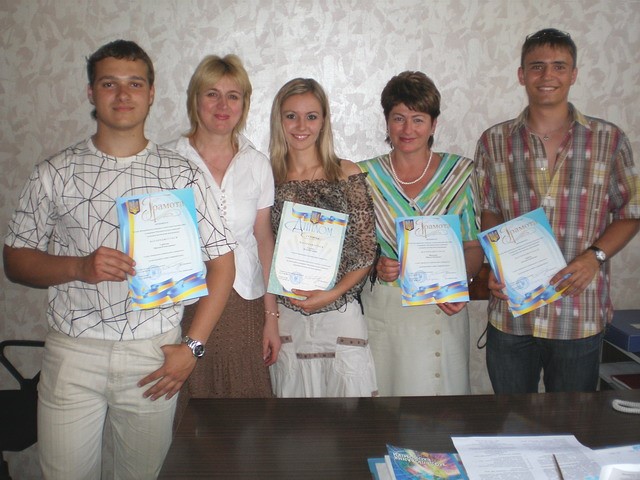 Рис.1. – Переможці II етапу Всеукраїнського конкурсу студентських наукових робіт за напрямом «Кількісні методи в економіці» Єськова Ю., Горбатюк М., Шевченко М. з науковим керівником проф. Максишко Н.К. та деканом Прушківською Е.В.